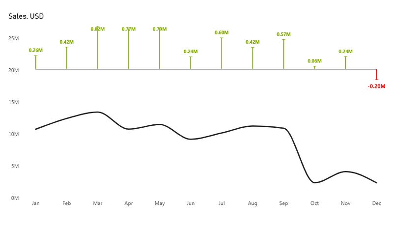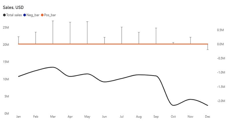 Neg_bar = 0Pos_bar = 0Create three measures: one to calculate the difference from the previous year, one for positive values, and one for negative.