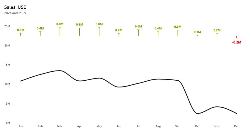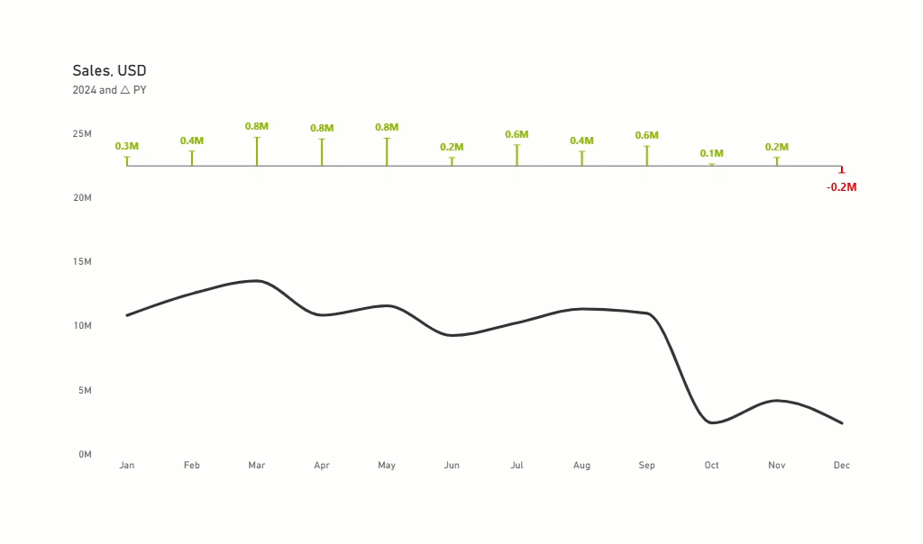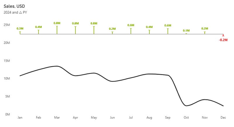 Subtitle = MAX(DimCalendar[Year]) & “ and △ PY”We made final tweaks to the formatting and added a tooltip.